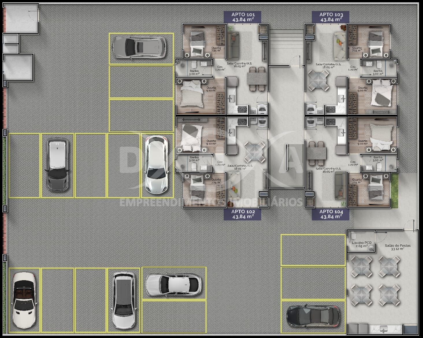 04 apartamentos por andar, todos contendo: